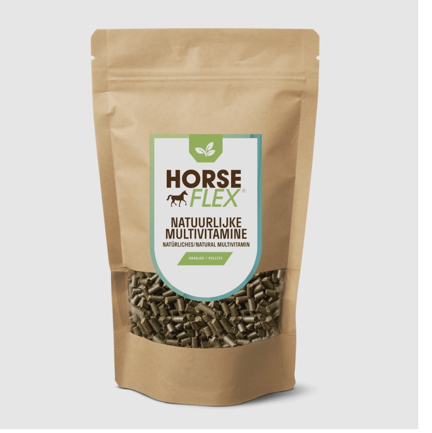 HorseFlex Natuurlijke Multivitamine zit bomvol aan volledig natuurlijke vitamines voor paarden. Dit zijn vitamines die de ingrediënten van nature bevatten. Zo is spinazie van nature rijk aan vitamine A, B en K, is rozenbottel een enorme vitamine C bron en bevat zeewier een grote variëteit aan vitamines en mineralen. Door verschillende groenten en kruiden samen te voegen, hebben we een brokje met natuurlijke vitamines ontwikkeld waar geen synthetische vitamines aan zijn toegevoegd. Zo kunnen de vitamines optimaal worden opgenomen door het paardenlichaam en krijgt je paard geen onnodige en ongezonde vulstoffen en bindmiddelen binnen, zoals melasse en granen. Bovendien wordt het paardenlichaam zo aangezet om zelf de vitamines uit de ingrediënten op te nemen waardoor er een hogere opneembaarheid is dan wanneer er op een kunstmatige manier vitamines aan toegevoegd zouden worden.